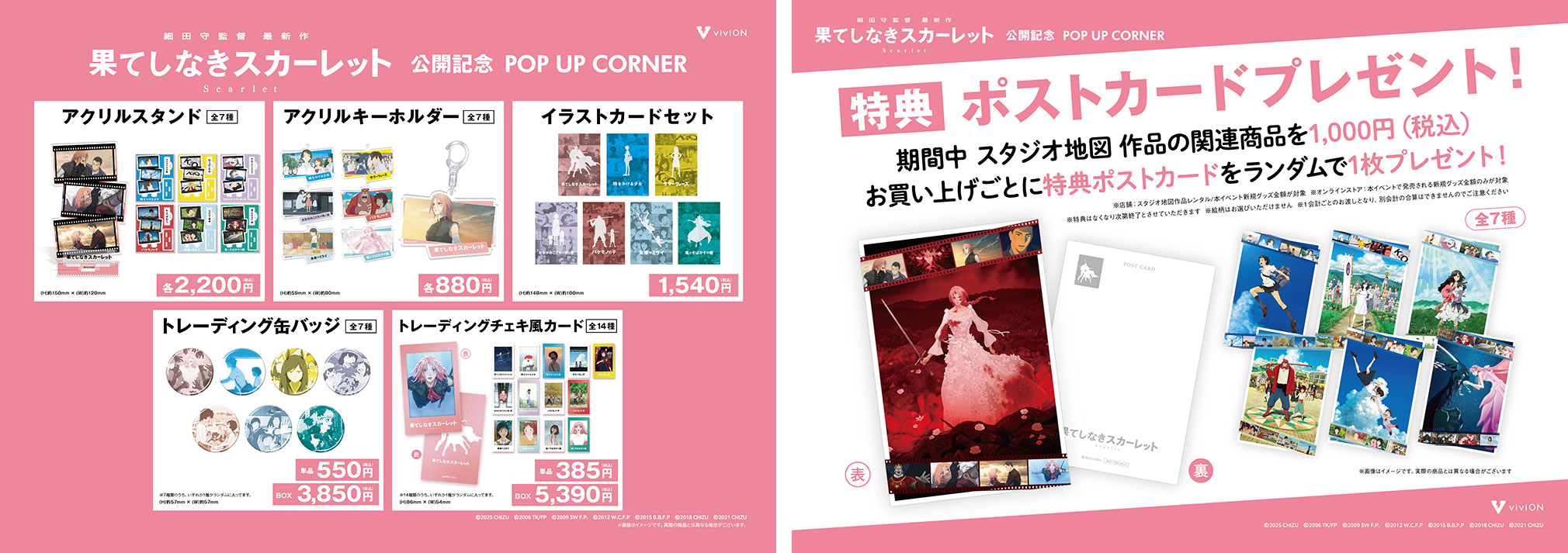 2025年11月7日(金)より、GEO(ゲオ)の対象50店舗にて、期間中フェア特設棚を設置し、最新作『果てしなきスカーレット』をはじめとした「スタジオ地図」全7作品の新規グッズを販売!同時にオンラインストア「viviON BLUE」でも同商品の販売を実施致します。さらに本イベントでは期間中に「スタジオ地図」作品のレンタルを含む関連商品を1,000円(税込)お買い上げごとに特典ポストカードをランダムで1枚プレゼント!
